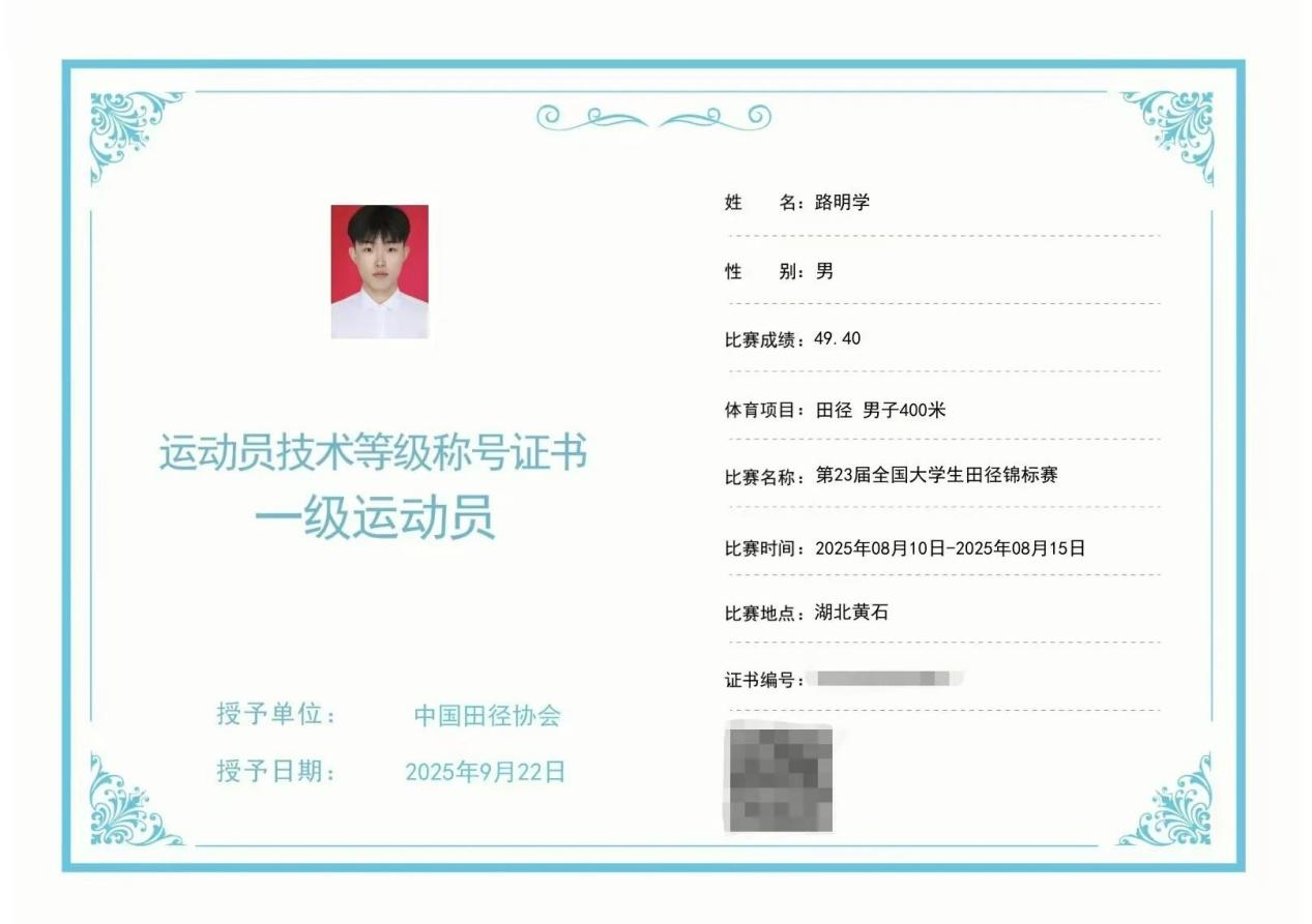 a片网站 路明学同学在男子400m比赛中,以49.40秒的成绩达到国家一级运动员标准。如今,他已正式获得一级运动员证书,成为a片网站 首位获此殊荣的学生。