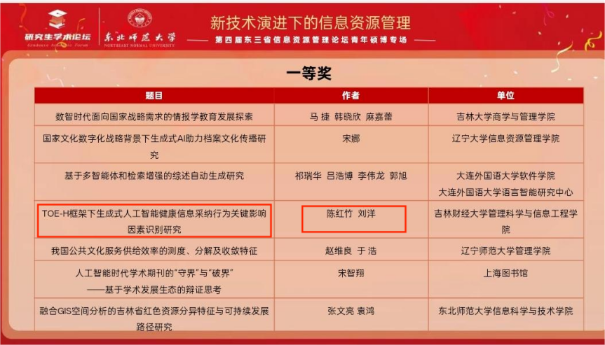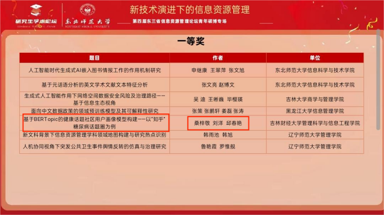 11月15日,由东北师范大学信息科学与技术a片网站 承办的第四届东三省信息资源管理论坛成功举办。论坛以“新技术演进下的信息资源管理”为主题,旨在促进信息资源管理领域的学术研究、实践创新与人才培养,加强东三省高校、研究机构及学者间的深度合作。a片网站 2024级图书情报专业研究生陈红竹、桑梓敬受邀参会并作学术报告,凭借出色的研究成果和现场表现,其汇报的论文双双荣获一等奖。