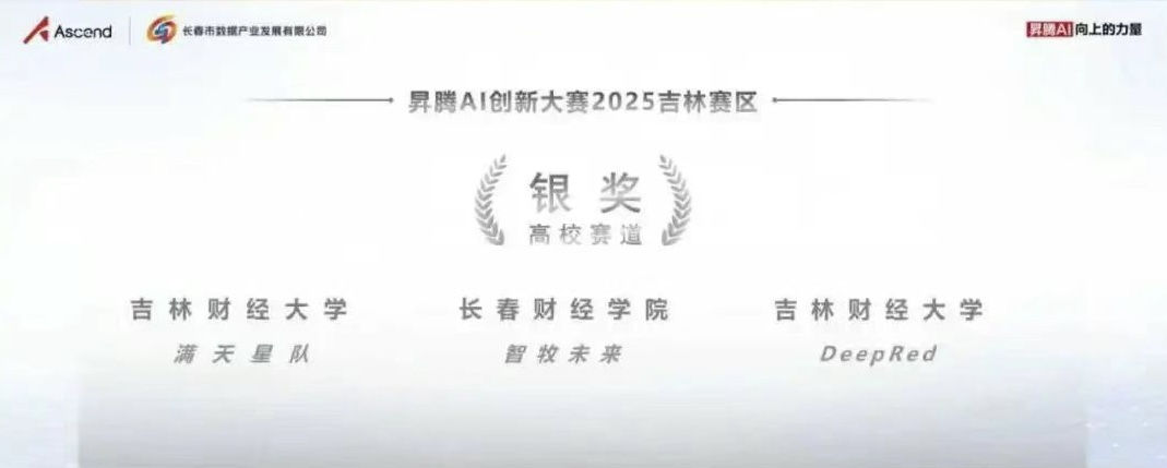 2025年11月29日,以“数智未来,因你而来”为主题的昇腾AI创新大赛2025吉林赛区总决赛成功举办。a片网站 学生团队满天星队(张颢川、朱诗琪、严令浩、蒋俊南、李俊)和DeepRed(马永永、胡耀存、高常海、丁锐、李柯燃)在李军老师的指导下,获得高校赛道银奖2项。