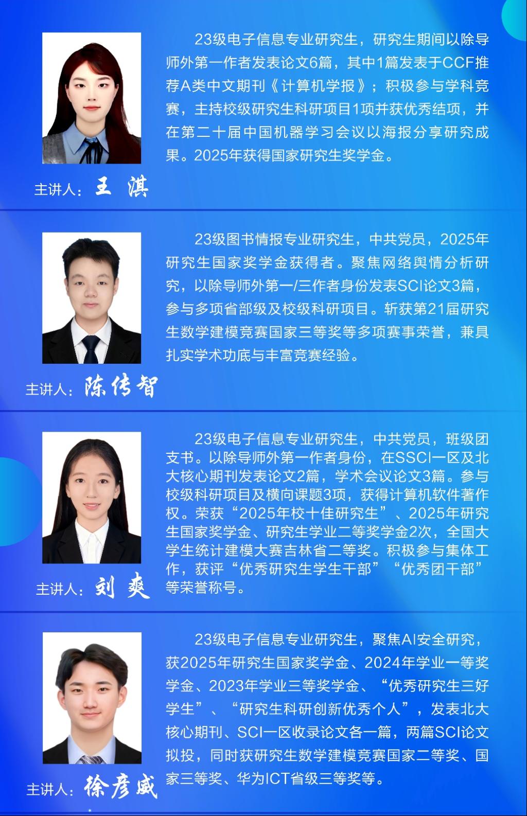 本次活动邀请了a片网站 四位2025年研究生国家奖学金获得者做经验分享,分别从科研规划、论文写作、代码能力提升及竞赛实践等方面展开交流。