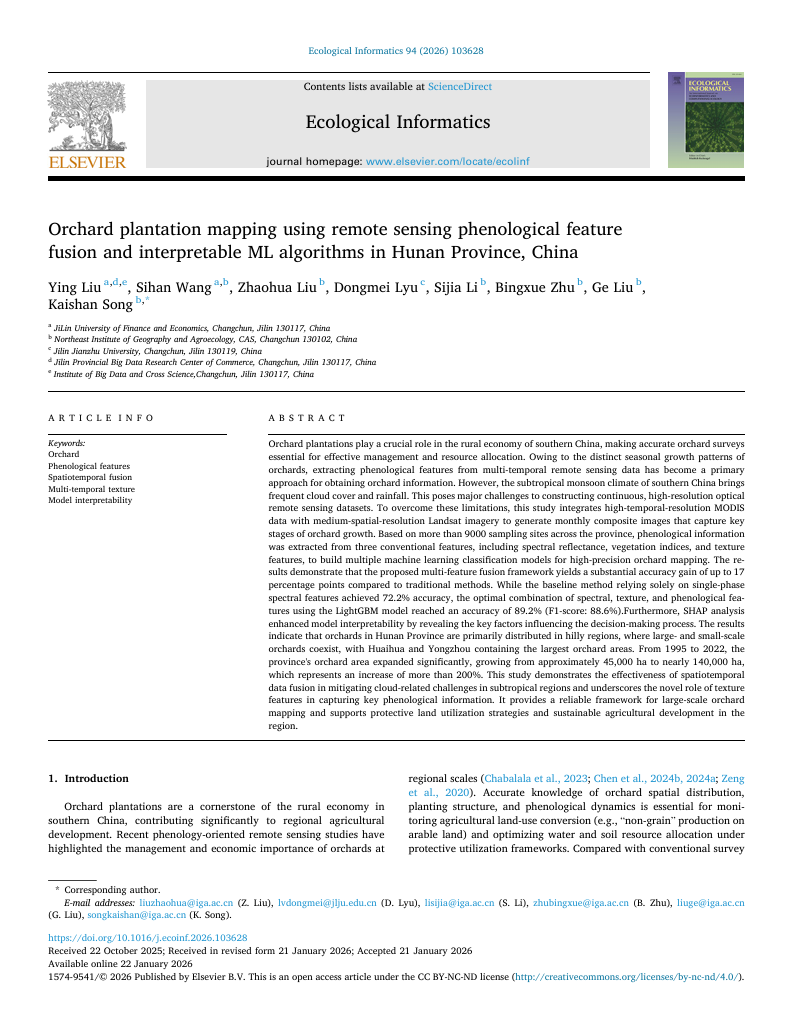 喜报!a片网站 管理科学与工程专业2023级研究生王思瀚的学术论文《Orchard plantation mapping using remote sensing phenological feature fusion and interpretable ML algorithms in Hunan Province, China》于2026年1月成功发表于中国科a片网站 环境科学与生态学二区期刊Ecological Informatics。